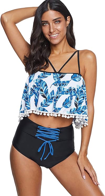Lallc - Women 2Pcs Padded Ruffle Strappy Crop Tops High Waist Bikini ...
